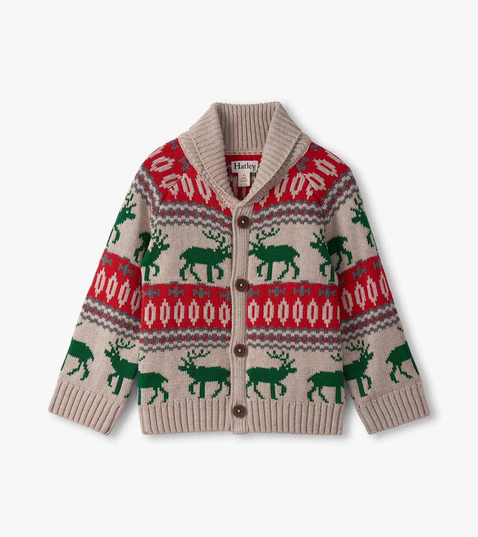 The Hatley Winter Elk Shawl Collar Cardigan is a cozy layering piece designed with timeless holiday style, crafted from a soft cotton-acrylic blend for warmth and durability. Its beige base is accented with green, red, and gray in a traditional Fair Isle pattern, featuring reindeer motifs, geometric designs, and decorative stripes across the body and sleeves. A ribbed shawl collar adds extra coziness, while the four-button front placket with wooden-style buttons gives it a classic finish. Complete with ribbed cuffs and hem for a snug fit, this cardigan is perfect for festive outings and chilly days.