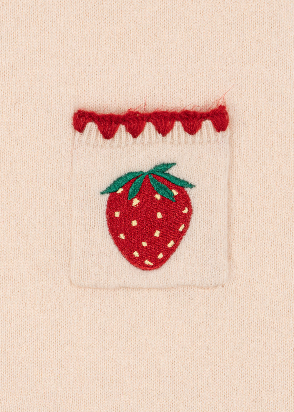 Knitted wool dress by Konges Slojd in an exceptionally soft and comfy quality with delicate strawberry embroidery. Designed with front patch pockets and a straight, fitted silhouette. In Buttercream.