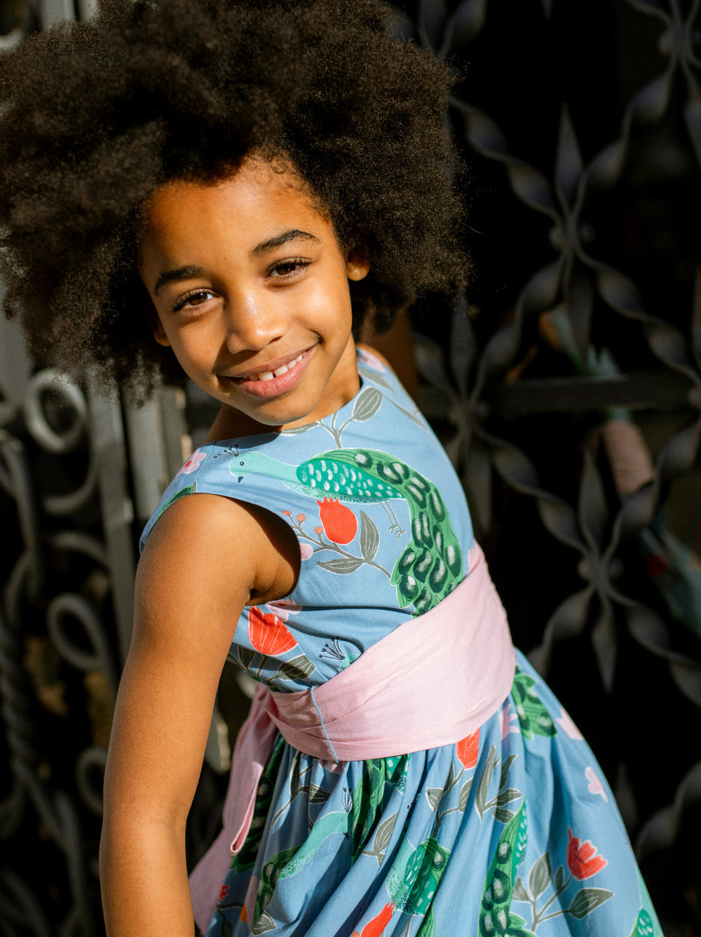 Designed for moments that call for something truly special, this heirloom-worthy dress from Tea Collection is made to be remembered. The striking Peacock Floral print--featuring graceful peacocks and pomegranates inspired by the intricate beauty of the Alhambra--brings artful storytelling to every detail. A full, hi-lo skirt creates beautiful movement, while the fully lined cotton poplin adds structure and polish. An adjustable sash ties into a statement bow at the waist (wear it at the side or back for a custom look), and a crew neckline in front gives way to an elegant V-back for an extra touch of charm. Perfect for celebrations and milestone moments, this is a dress made to be worn, treasured, and passed down.