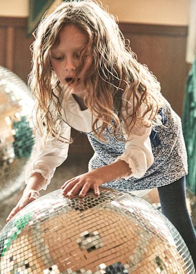 This playful holiday dress combines a sparkly blue boucle pinafore with a silky shirt featuring a charming ruffle collar. Designed to look like two pieces in one, it’s accented with navy velvet bows on the sides that add a fun, festive touch!