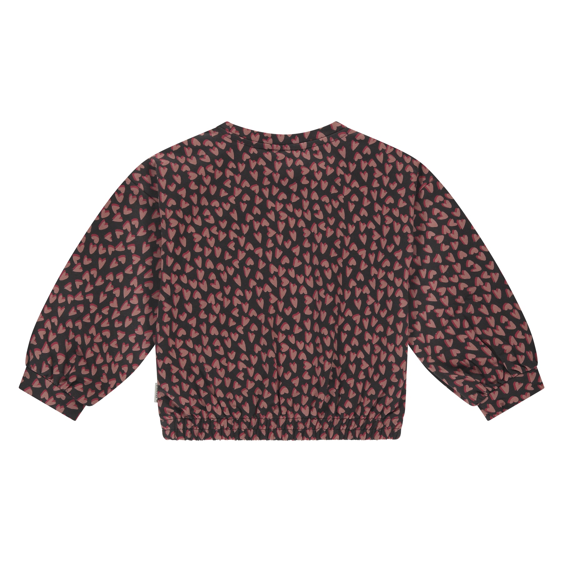 This cozy sweatshirt from Stains & Stories is done in a cute pink and red hearts print on a black background. Puffy sleeves and elastic waist give it a blousy effect.