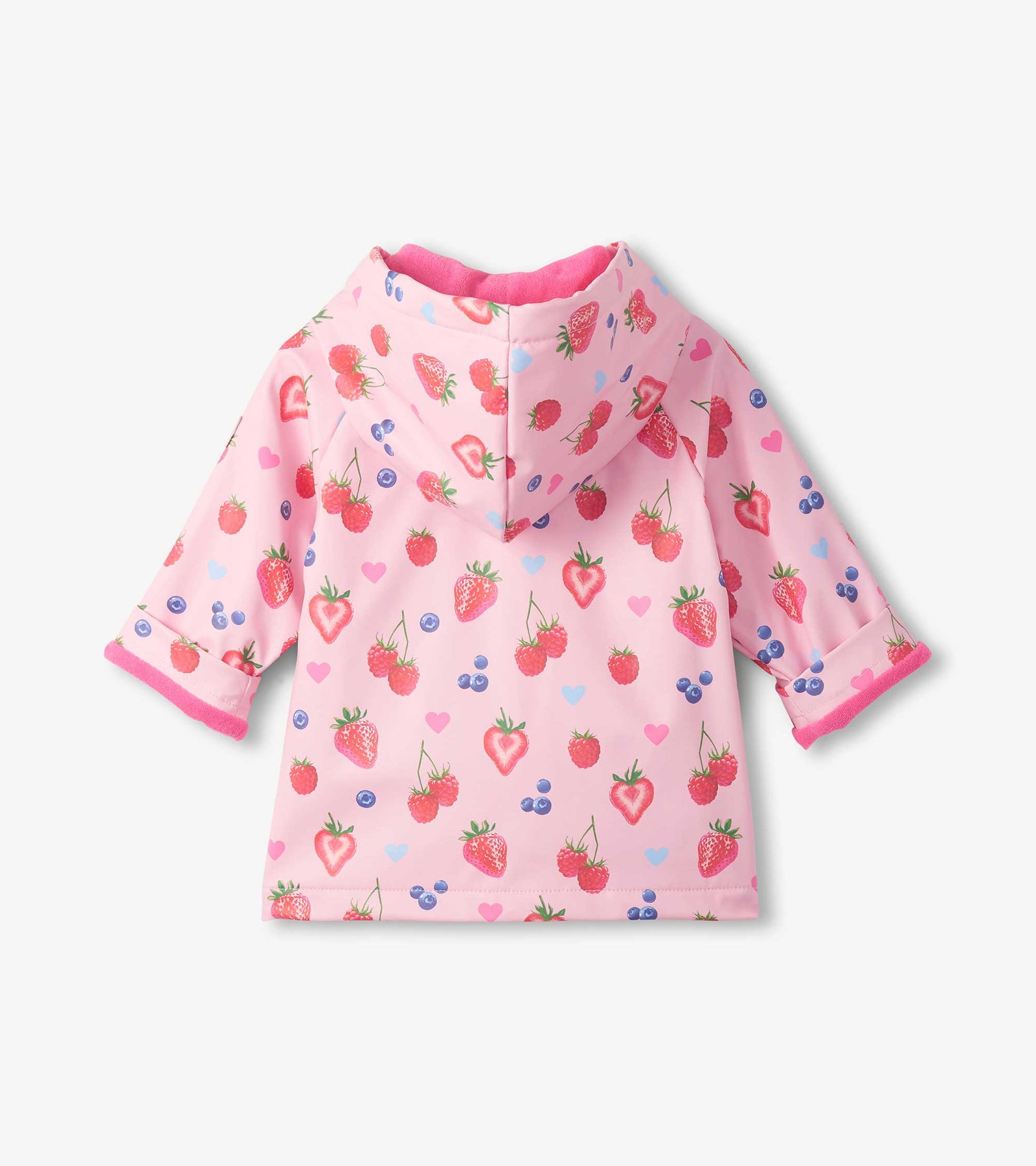 Sweeten up stormy days with this rainy day layer from Hatley! Designed with a soft blush pink background and an all-over print of strawberries, raspberries, blueberries, and tiny heart motifs, this waterproof jacket is as fun as it is functional. It features a cozy, bright pink lining for added warmth, matching bright pink buttons for a cheerful pop, and practical front patch pockets for keeping hands dry or treasures safe