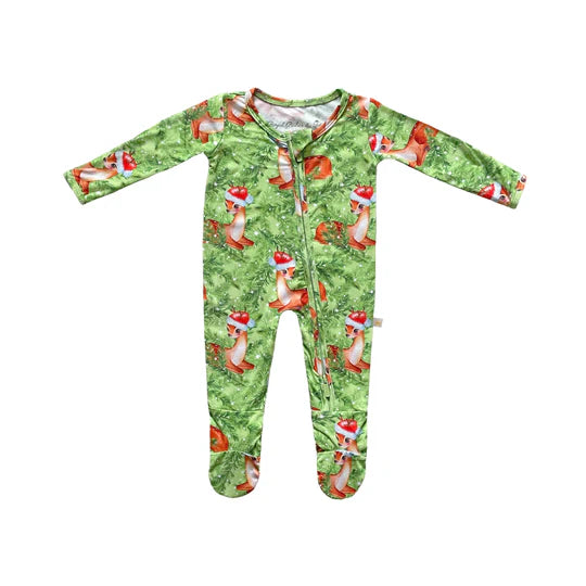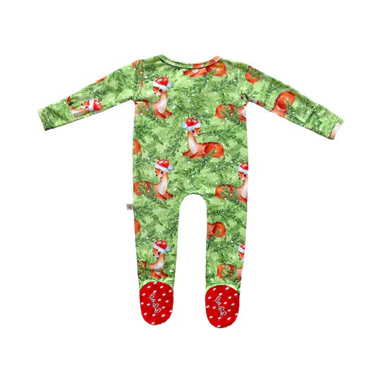 Celebrate the holidays with a touch of woodland magic in the Fawns Through the Snow Footie, where adorable fawns wear Santa hats nestled among holiday greenery. These playful footies bring seasonal cheer and warmth to your feet, making them perfect for festive lounging or gift-giving.