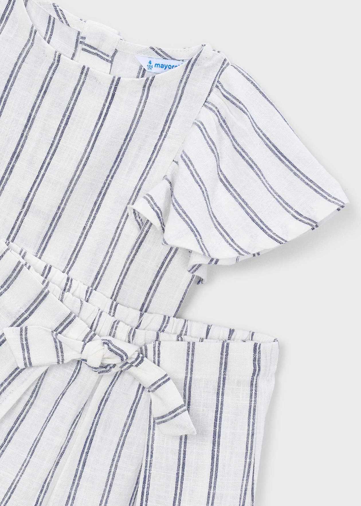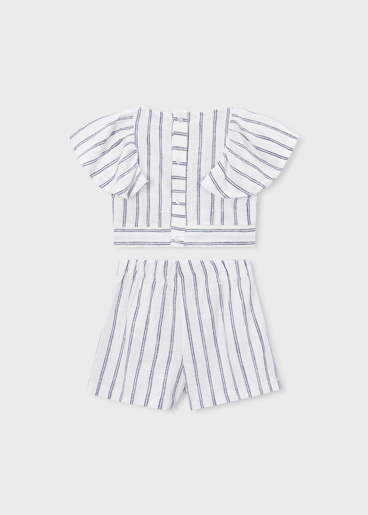 This adorable two-piece set from Mayoral features a navy pinstriped top with charming flouncy sleeves and back button details, paired with a matching skort that ties at the front. Crafted from soft, draping fabric that moves beautifully, it's perfect for playdates, school days, or weekend adventures. The relaxed fit and gentle flow make it as comfortable as it is cute.