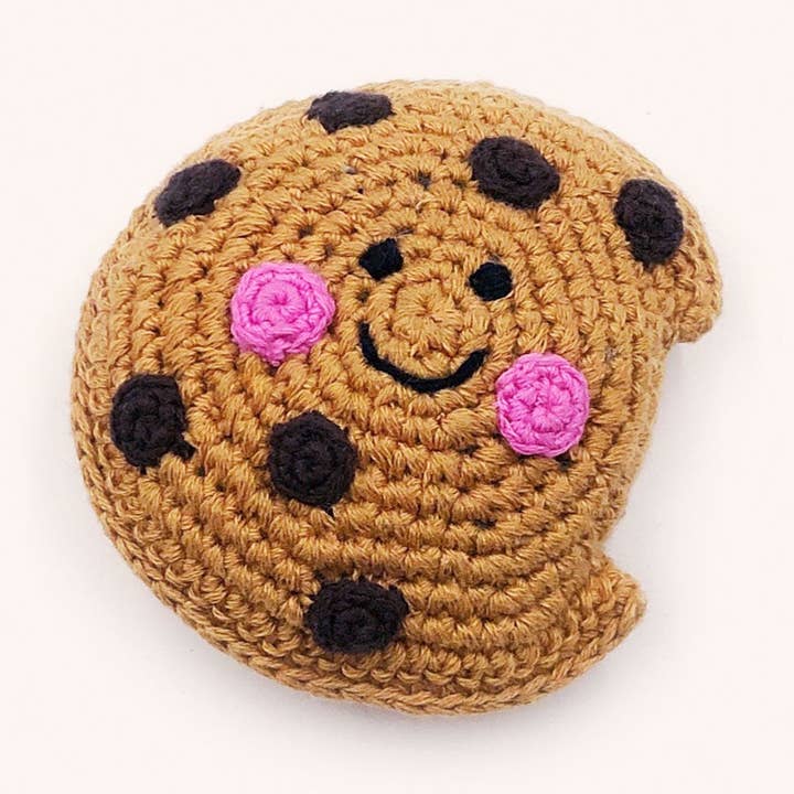 This plush chocolate cookie toy looks tantalizing enough to eat! In fact, it looks like someone took a bit out of it already! The rattle inside makes a soft jingle when shaken. Handmade with soft cotton yarn, this playful stuffed baby toy is lightweight and full of hours of imaginative, sweet fun! Pairs well with our donuts.