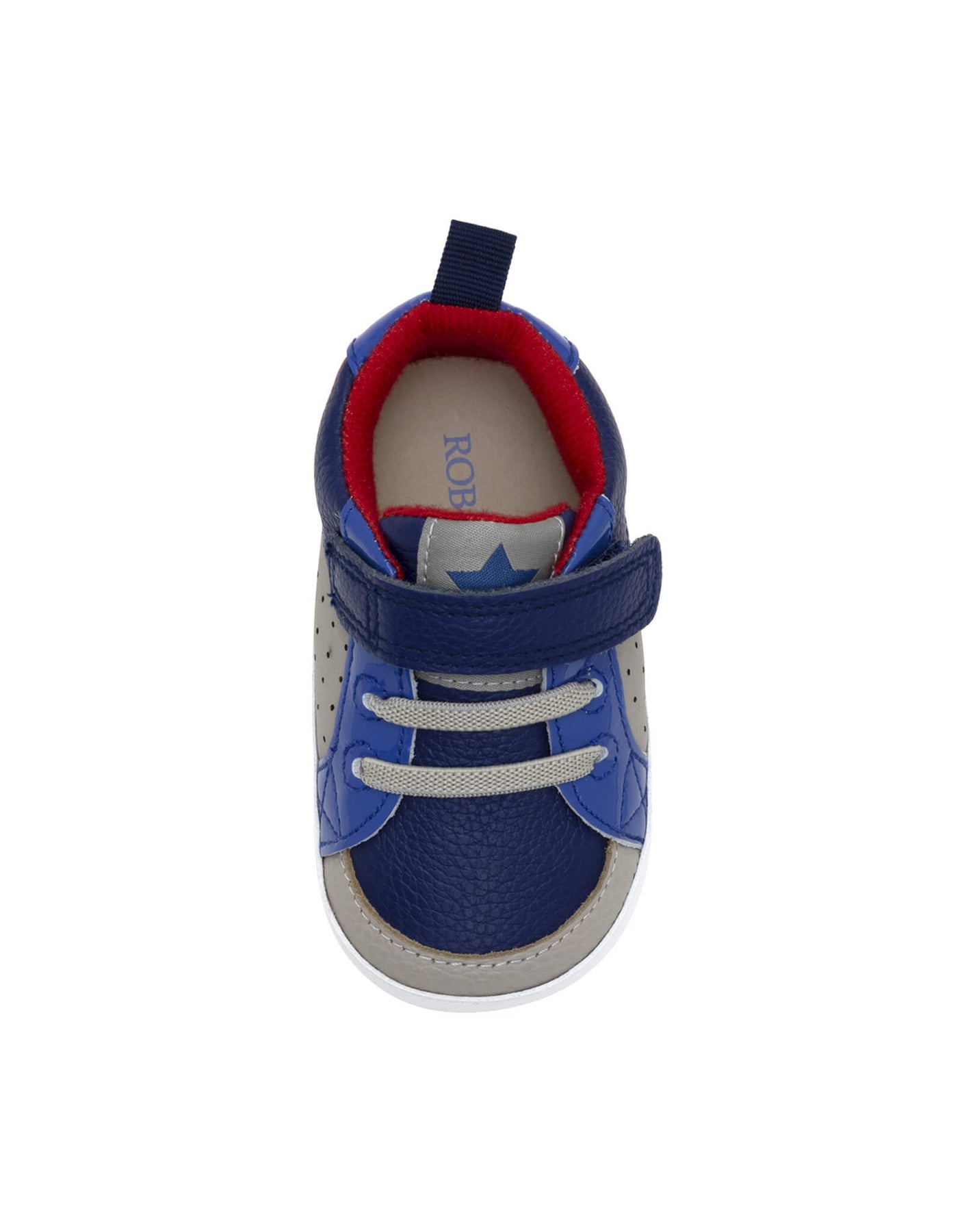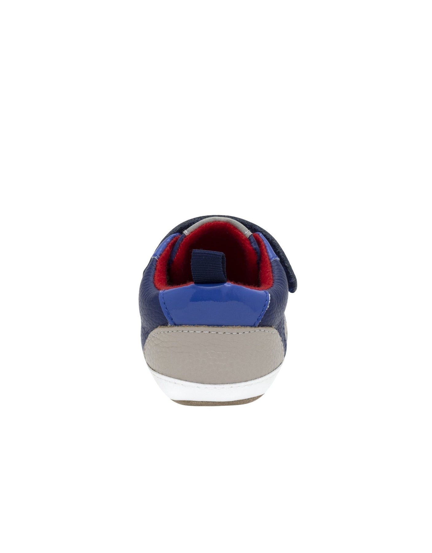 The Jarette First Kicks from Robeez blend classic style with everyday comfort. Made with a mix of navy and brown leather, this sleek design features a single strap closure for easy on-and-off, plus a bold red lining for a fun pop of color. The flexible sole and roomy fit support natural movement, making these kicks perfect for growing feet on the go.