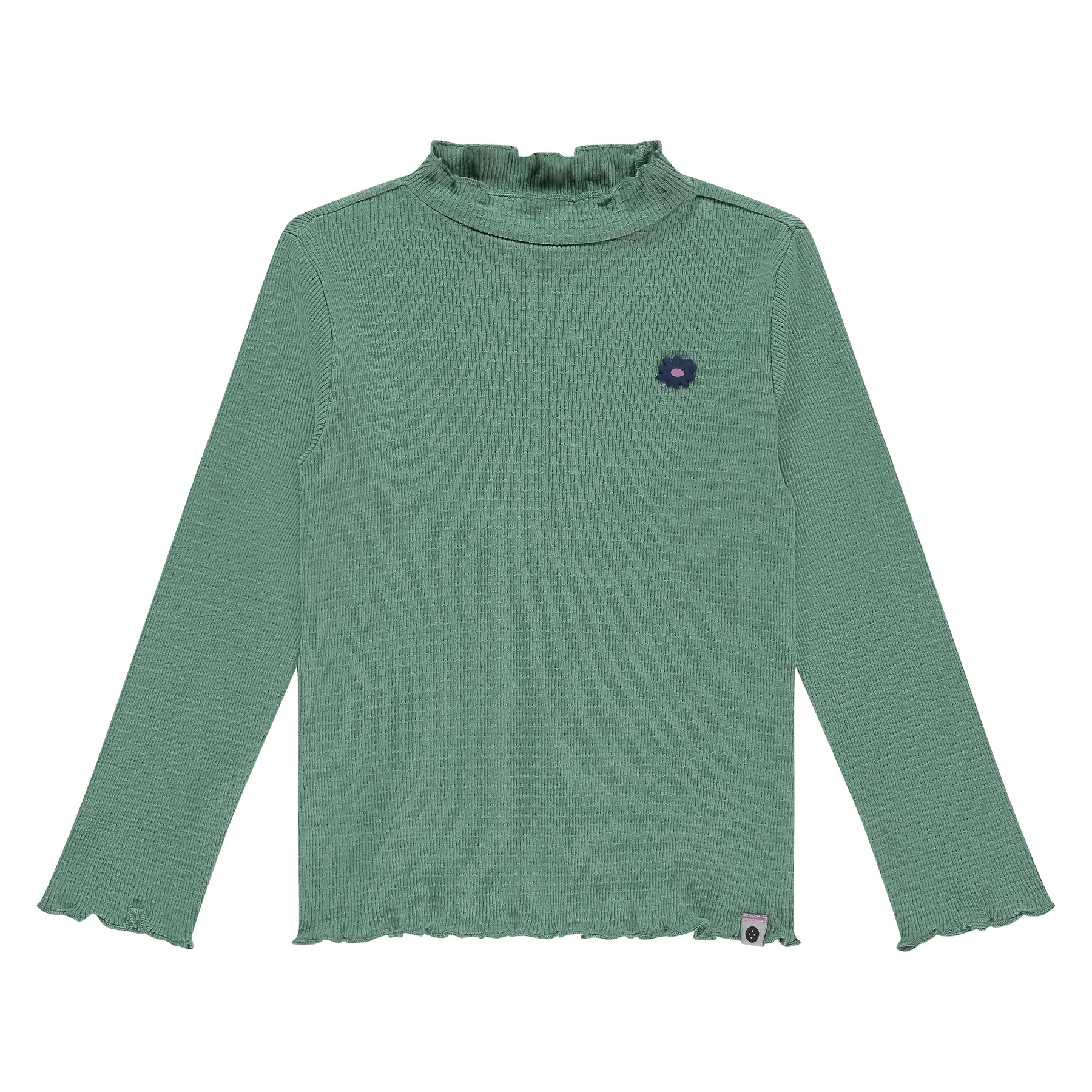 Red ribbed mock t-neck by Stains & Stories, with lettuce edges and rubbery flower detail on chest.