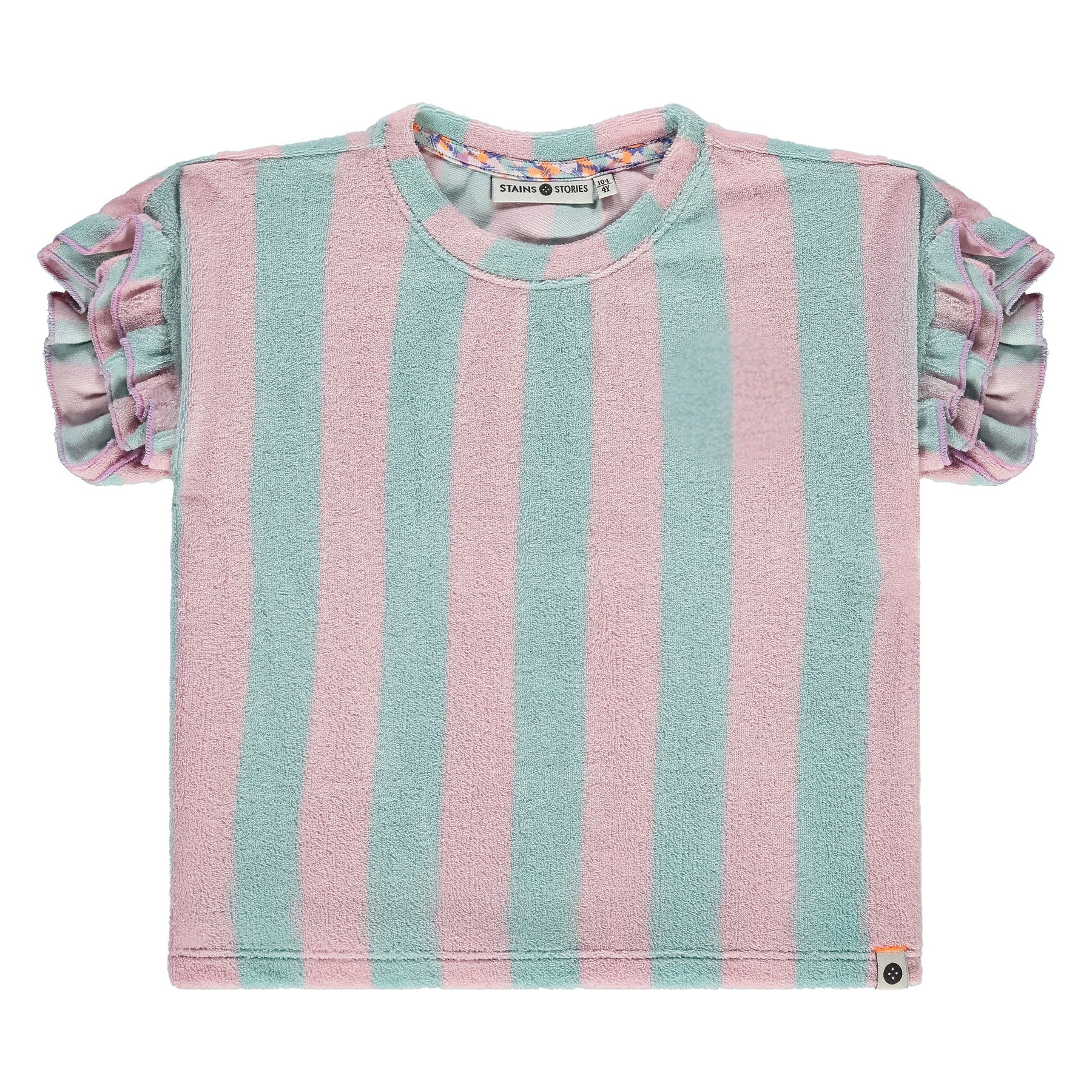 Adorable terry knit top featuring soft pink and mint stripes that bring playful color to any wardrobe. Ruffled sleeves add a charming, feminine touch perfect for everyday wear. Crafted from comfortable terry fabric, this tee keeps girls cool and cozy all day long.