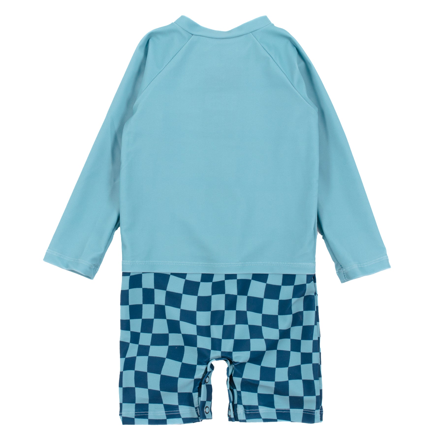Keep your little guy protected and stylish with the Cool Vibes Only Rash Guard from Noruk—a clever one-piece design that looks like separates! The solid top pairs perfectly with checked bottoms for an effortless, put-together vibe. Easy front zipper and convenient crotch snap buttons make diaper changes and bathroom breaks a breeze. UPF protection keeps delicate skin safe from the sun while he splashes and plays.