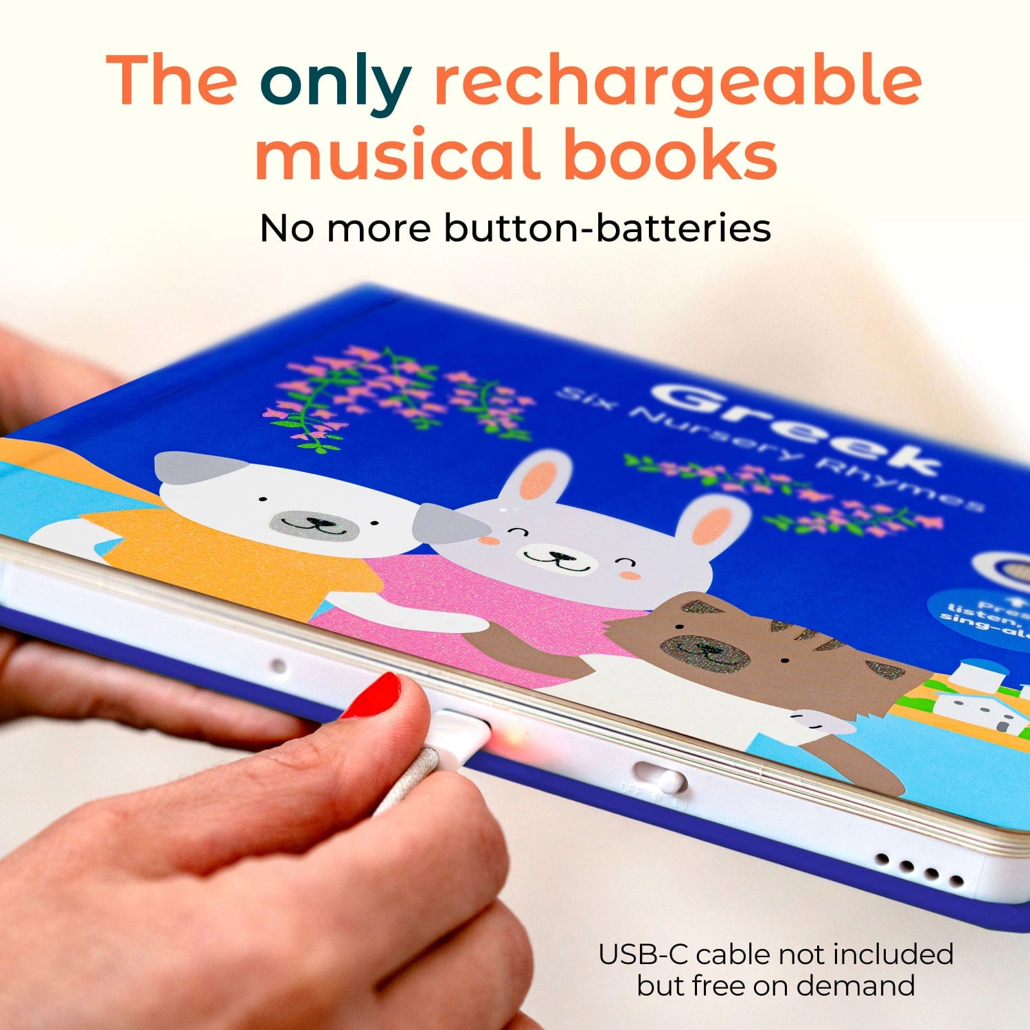 Introducing the Greek Nursery Rhymes Sound Book from Cali's Books! Immerse your child in the enchanting world of nursery rhymes with this interactive book designed for toddlers aged 1-3. It's a musical delight that introduces beloved Greek songs like "Kounelaki," "Feggaráki mou labró," "Mia oraía petaloúda," "Sfaíra," "Ítan éna mikró karávi," and "Yíro yíro óloi." Each page features engaging Greek and English versions and a soft push-button for playing the tunes. This musical book is entertaining and safe for your little one. With rounded corners and thick pages, it's perfect for babies aged 6 to 12 months, making it an ideal choice for baby books and toddler books.