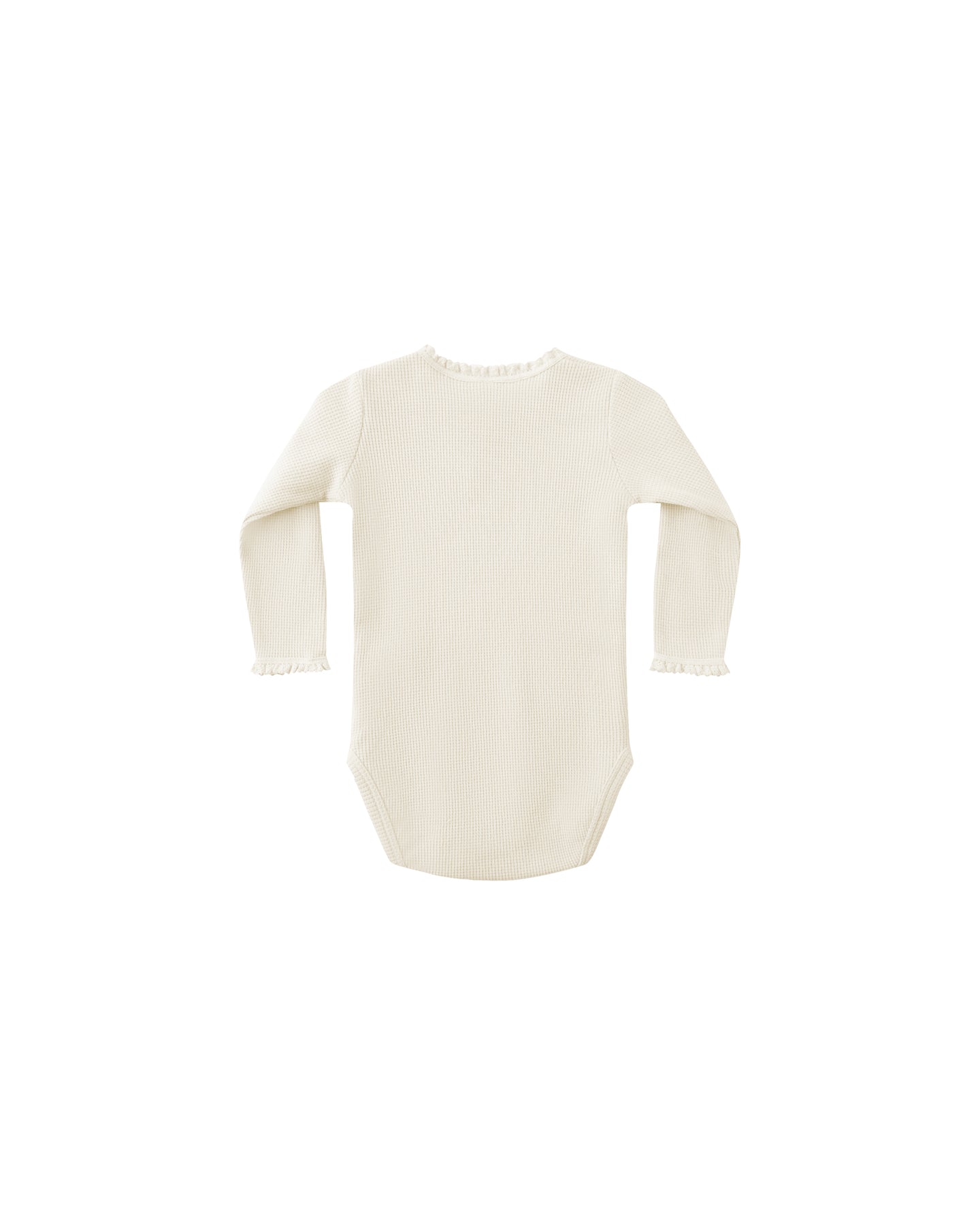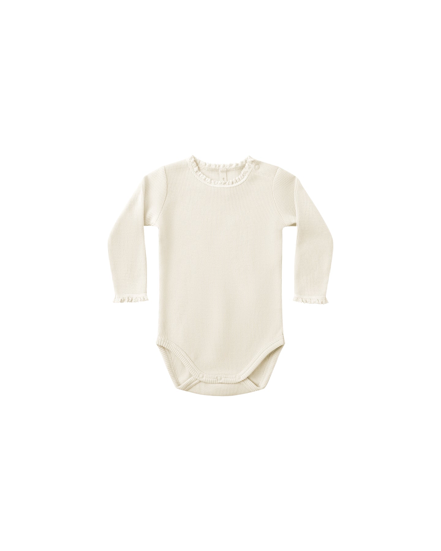 Long sleeve onesie in Quinch Mae's lightweight waffle knit, featuring the sweetest crochet lace ruffle detail. Designed with shoulder and bottom snaps for easy changes.