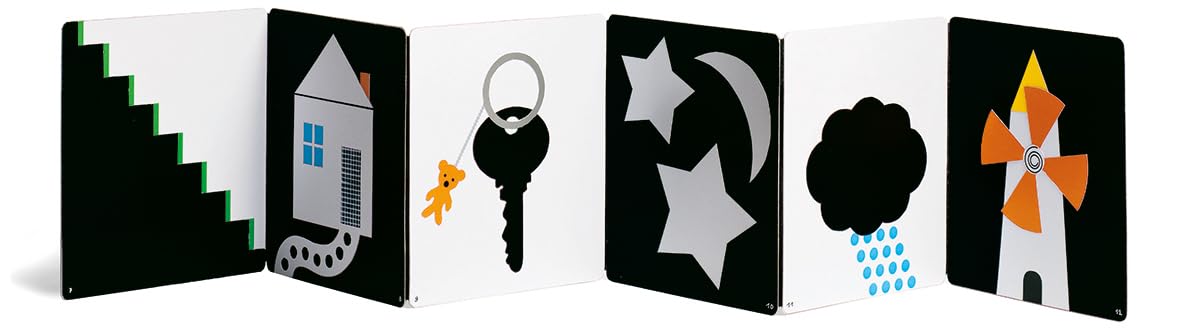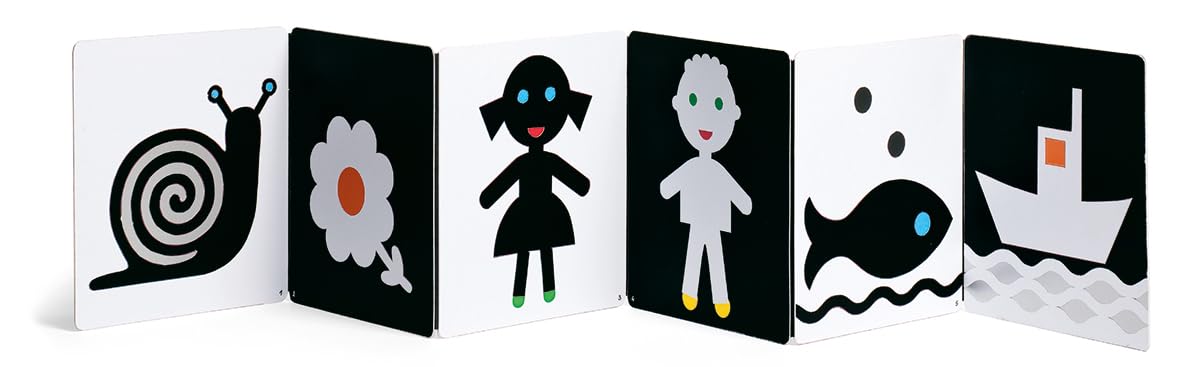 Discover the joy of play and learning with this engaging black-and-white sensory book, designed to boost babies’ development. Your child will enjoy looking at their reflection, peeking through holes, tracing trails and uncovering opposites. This beautiful fold-out accordion board book is the perfect first board book for babies.