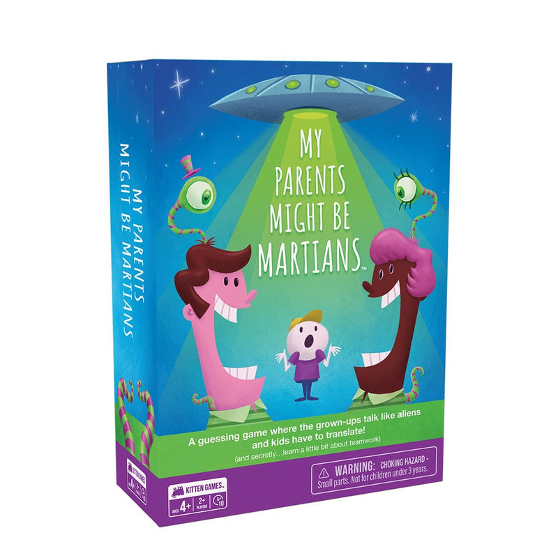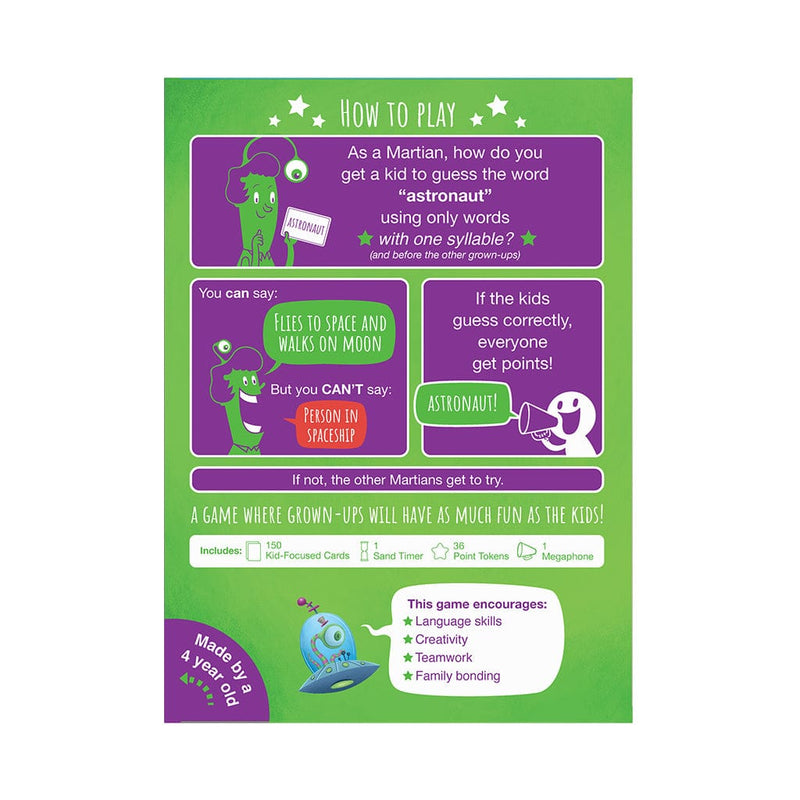 The goal is for the Martians to get their Human friends to guess a word by only using clues with single-syllable words. The Humans have to work together to make sense of your silly speech before the timer runs out. This game is an out-of-this-world way to improve your little ones’ teamwork and language skills.