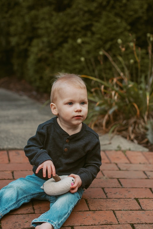 Pumpkins are yummy, they're sweet, and now baby can have one too! This friendly pumpkin rattle is always smiling and makes a great addition to any play kitchen.